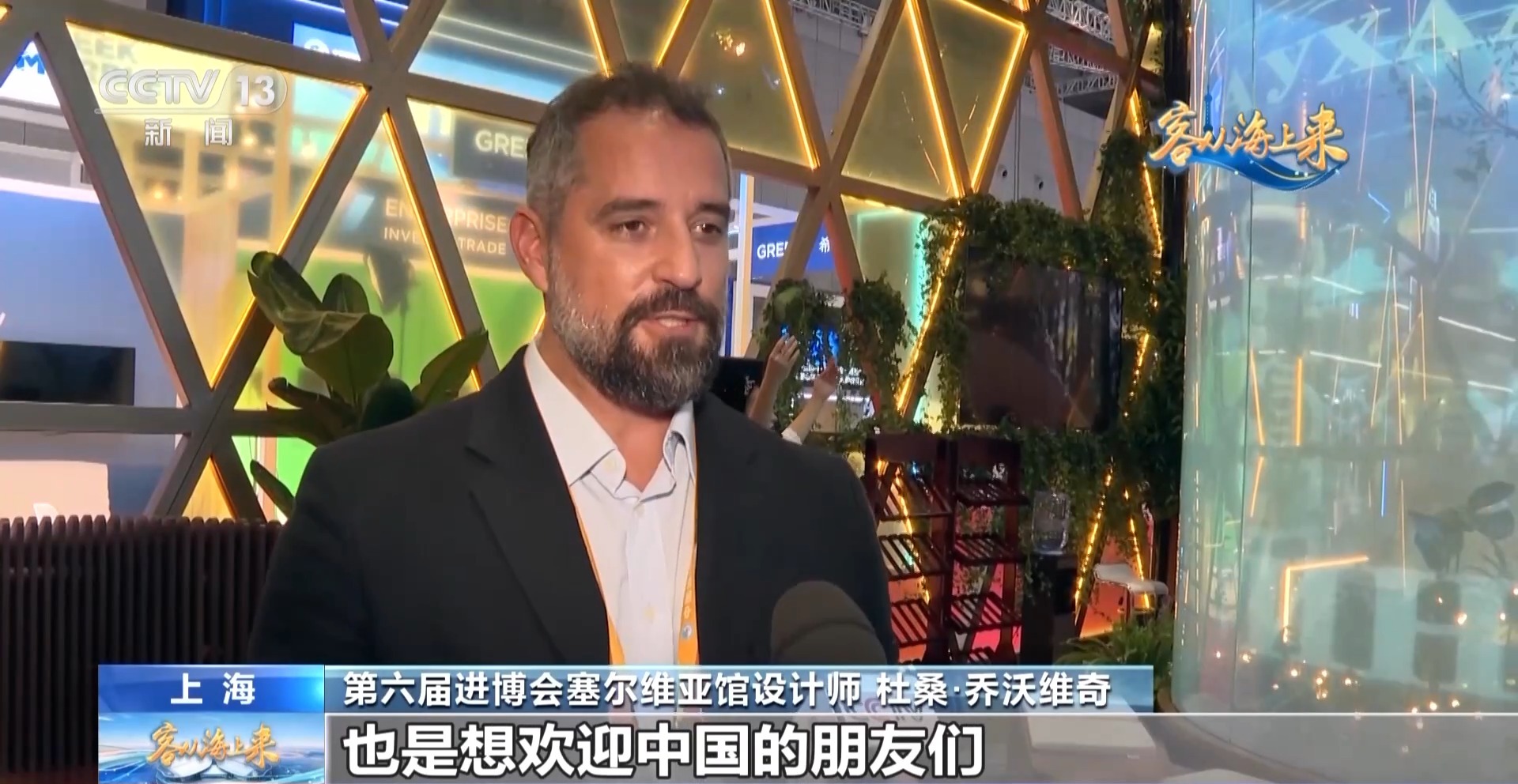第六届进博会塞尔维亚馆设计师杜桑·乔沃维奇ღ◈✿:这是一首塞尔维亚的传统歌曲ღ◈✿,表达的是爱和团聚AG真人ღ◈✿,女生们的这种表演形式ღ◈✿,也是在表达团结的意思ღ◈✿。同时我们用这种表演形式ღ◈✿,也是想欢迎中国的朋友们ღ◈✿,来我们展区做客ღ◈✿。